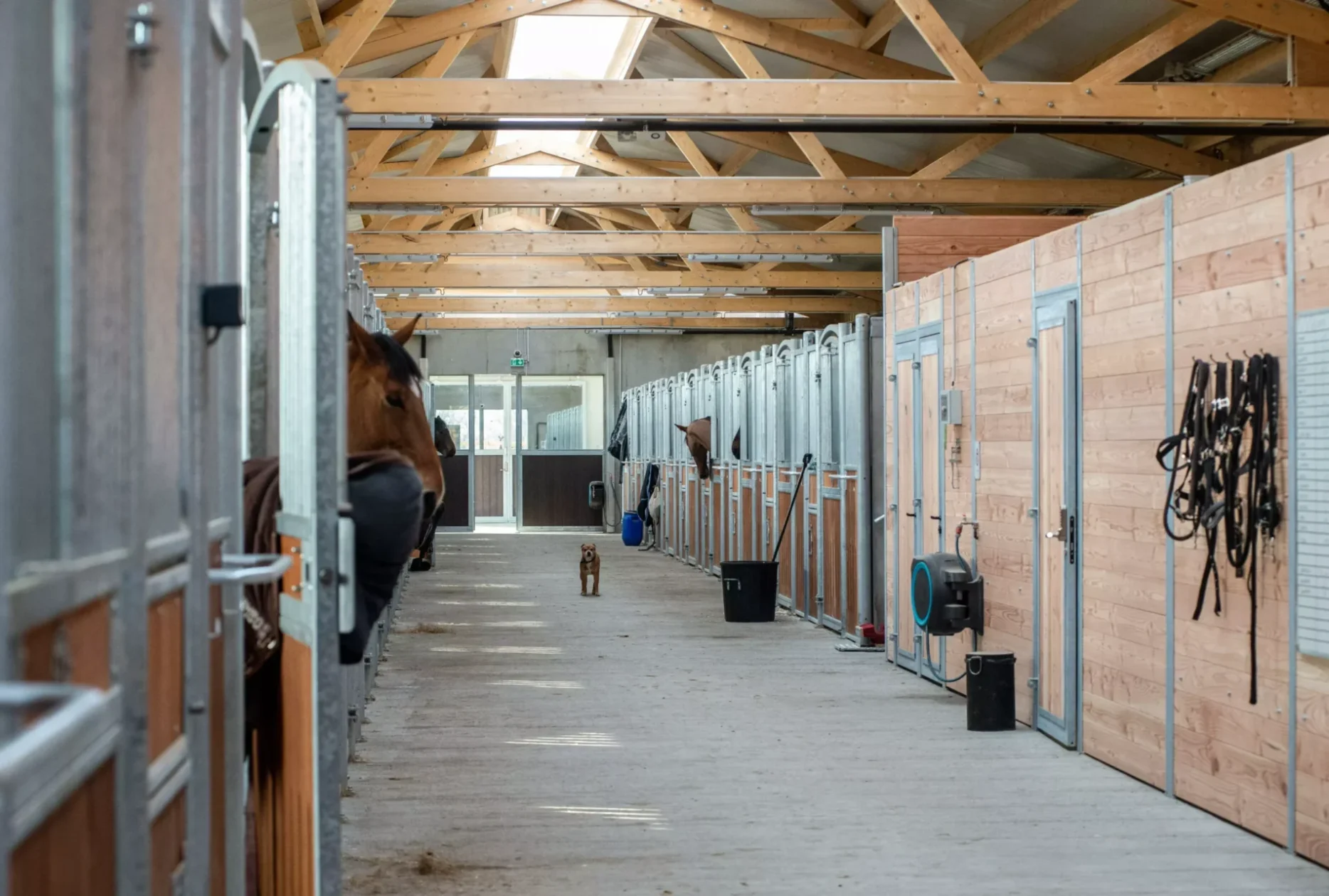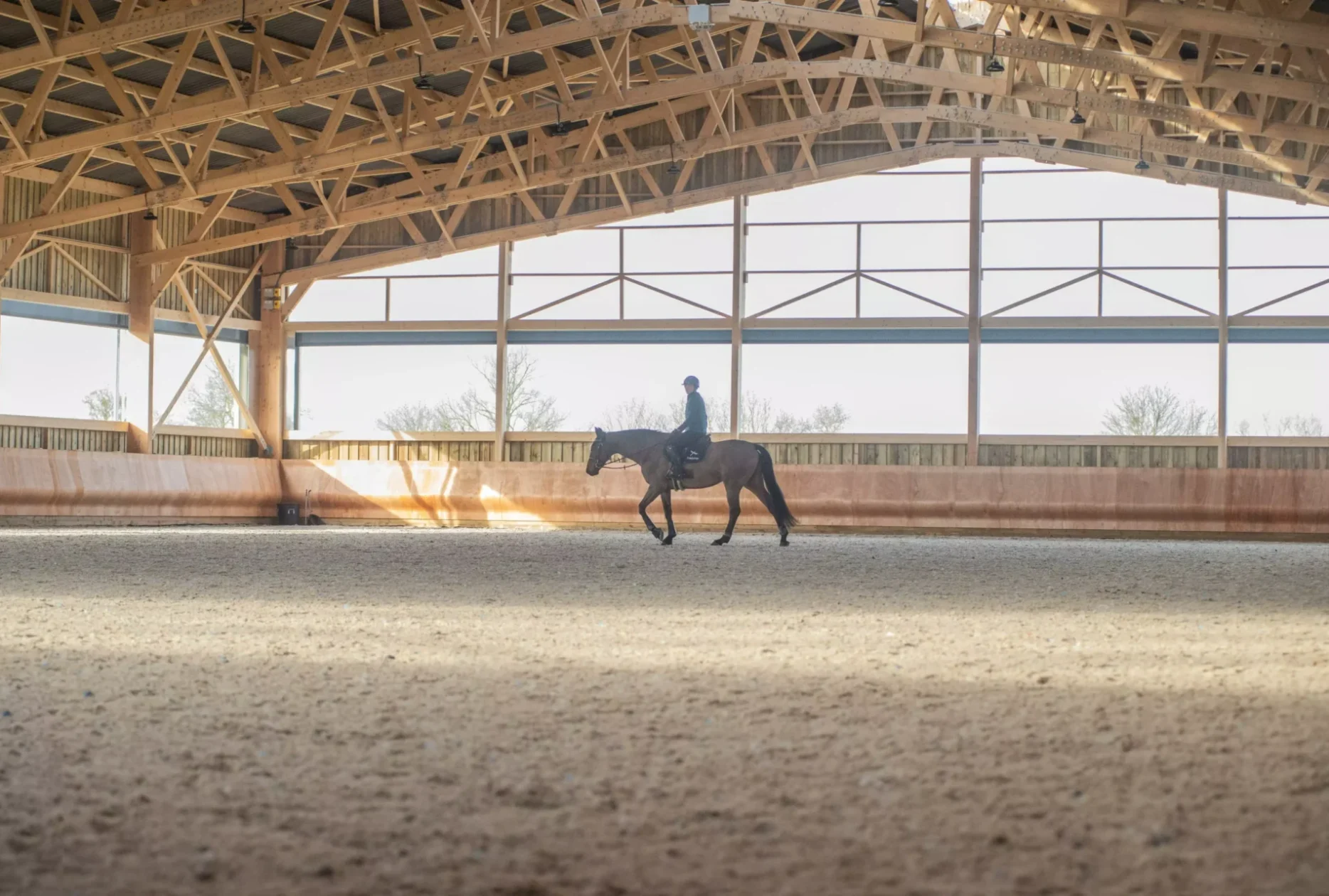 Bien-être équin : La structure en treillis bois confère aux 43 boxes un environnement lumineux et sain, avec acoustique douce et humidité régulée